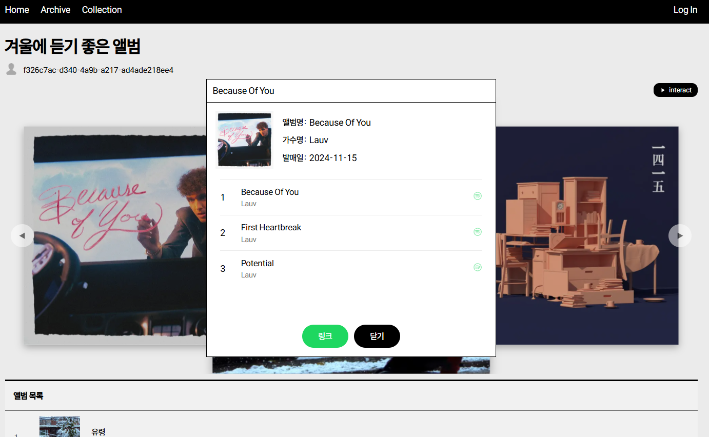 interact 버튼을 통해 재생 인터랙션 페이지로 이동하여, 해당 앨범들을 재생해볼 수 있음